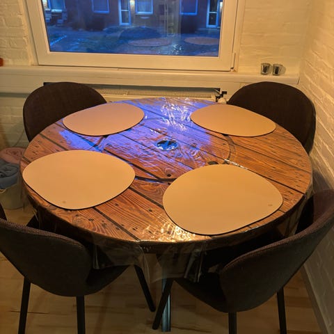 - Bordpladen er behandlet over flere gange med bordpladeolie, som er godkendt til indendørs brug og tilfører træet en vand- og smudsafvisende overfade.