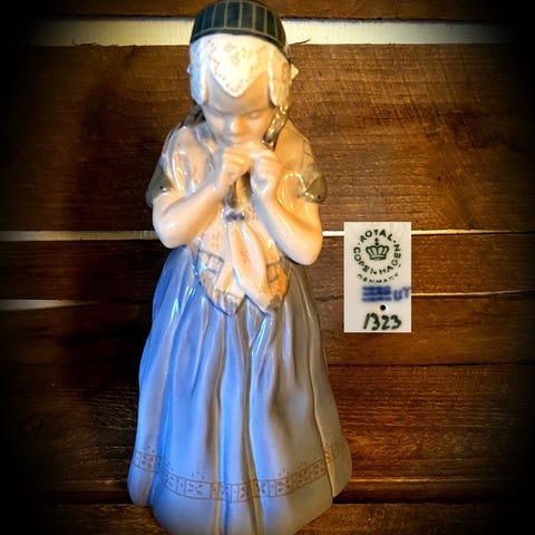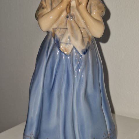 21 cm høj 1. Sortering Porcelænsfigur forestillende en pige i lang blå kjole med forklæde og hovedtørklæde. Figuren er glaseret i afdæmpede farver med detaljer i blandt andet blå, grøn og hvid. Egnet som pyntegenstand på hylde, reol eller i vitrineskab i hjemmet.