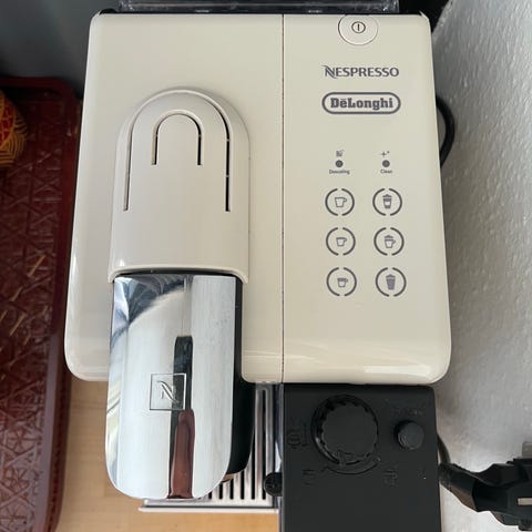 Nespresso DeLonghi kapsel kaffemaskine i hvid. Maskinen anvender Nespresso-kapsler og har integreret mælkebeholder til tilberedning af kaffedrikke med mælk. Der mangler et låg på vandtank. Sende gerne hvis modtager betaler fragt.