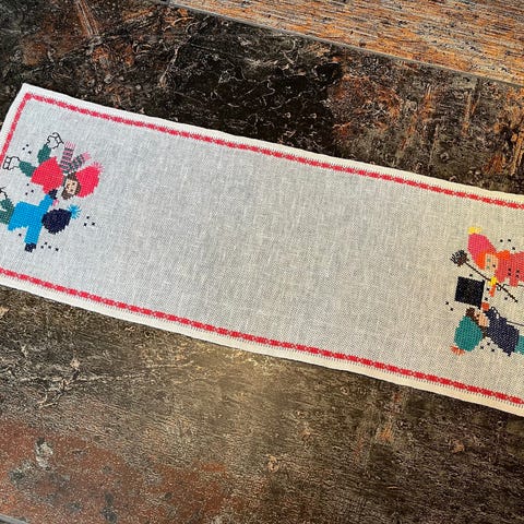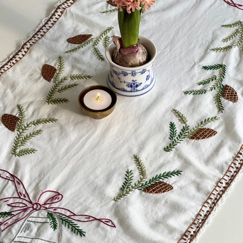 Løber til jule bordet, ægte retro julestemning, Juleløber / løber til bordet. Skab hyggelig julestemning i stue og køkken. Rød Løber broderet med juledekoration, julelys og Gran