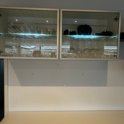 Jeg giver et vitrineskab fra 70'erne væk. Det oprindeligt brune skab er malet lyst og har alderssvarende brugsspor, men det er fuldt funktionsdygtigt. Det tilbyder masser af opbevaringsplads.