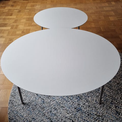 Rundt sidebord sæt i hvid. Består af to borde i forskellig højde og diameter, begge med glat, blank overflade. Velegnet som sofaborde, sengeborde eller sideborde i stue eller soveværelse. Kan bruges samlet som sæt eller hver for sig i forskellige rum.