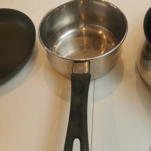 Gryde og greb i rustfri stål, 2 tude, alle komfurtyper også induktion. Ovnfast op til 220 gr. Tåler opvaskemaskine 175 kr