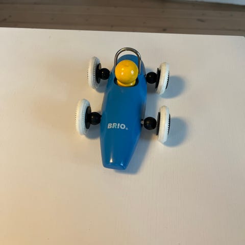 BRIO legebil i rød farve med sorte hjul og lille gul førerfigur. Bilen er udført i et solidt materiale med afrundede former, velegnet som klassisk legetøj til børn. Kan bruges til leg på gulv, bord eller andre glatte overflader.