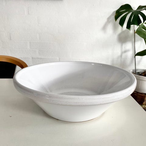 Flot og tidløst hvidt dejfad i meget kraftig hvidglaseret keramik. Fadet vejer næsten 2 kg, hvilket gør det stabilt og ideelt til æltning af dej, grødfad eller som en dekorativ frugtskål.