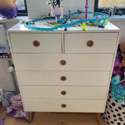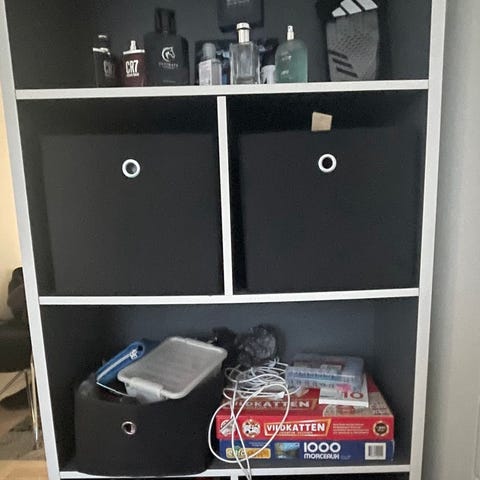 Reol med kurve. Kommode.