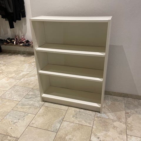 Hvid træreol med kurve af gråt stof, i fin stand.