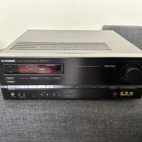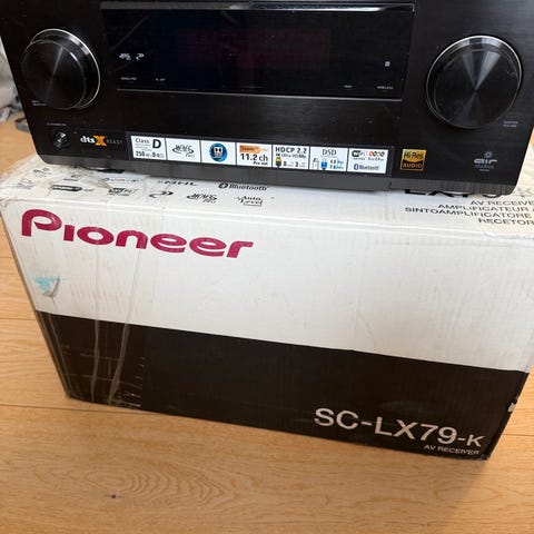 Pioneer surround receiver i sort. Enheden har frontbetjening med store drejeknapper til volumen og indstilling samt flere indgange og udgange på bagsiden (ikke vist i billedet). Receiveren er egnet til brug i hjemmebiograf eller stereoopsætning med tilslutning af tv, medieafspillere mm