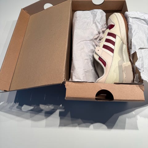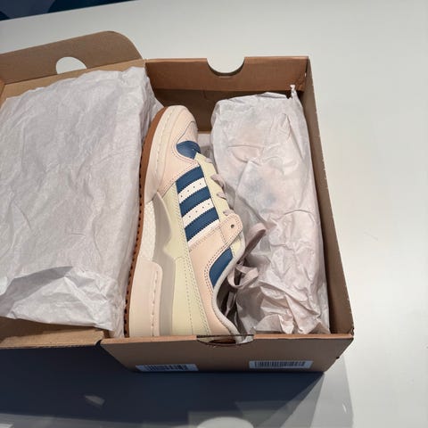 Adidas sneakers i str. 40. Modellen er en lav sneaker med snørebånd og velcrorem over vristen. Overdelen er primært hvid med blå og orange detaljer samt de klassiske Adidas-striber på siderne.