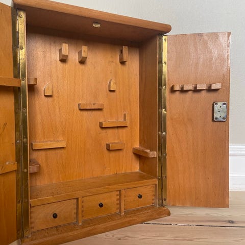 Solidt, gammelt træskab med masser af patina og historie. Skabet har tidligere været brugt som værktøjsskab og bærer tydeligt præg af dette med huller, mærker og spor efter ophæng – hvilket giver et råt og autentisk udtryk.