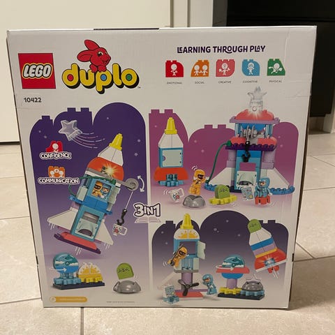 LEGO DUPLO City byggesæt med rumtema. Sættet indeholder rumraket, rumfærge, lille månebil, satellit og tilbehør til leg i rummet samt DUPLO-figurer i rumdragter. Velegnet til mindre børn, der vil bygge og lege med enkle rumscenarier i LEGO DUPLO format.