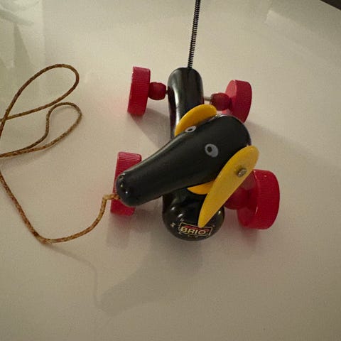 BRIO træ trækdyr formet som en mariehøne. Legetøjet er udført i malet træ i farverne sort, rød, gul og hvid og har fire hjul samt en snor foran, så barnet kan trække det efter sig. Egnet som klassisk træklegetøj til mindre børn, der øver balance og motorik, når de går og trækker dyret hen over gulvet.