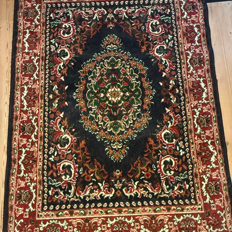 tæppe med orientalsk inspireret mønster i flere farver. Tæppet har et centralt medaljonmotiv og en detaljeret bort hele vejen rundt. Forsiden viser et tæt, fintmønstret design, mens bagsiden har en lysere, vævet struktur. Velegnet som gulvtæppe i stue, spisestue eller entré, hvor der ønskes et klassisk mønstret tekstil på gulvet.