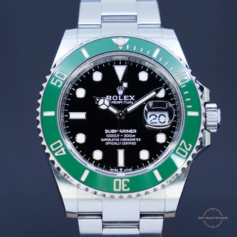 Rolex Submariner 126610LV Starbucks med bokse og papirer fra midt 2025. Uret fremstår i fin stand med lidt små hairlines og ridser. Den aktuelle LV-model af submariner i 41 mm. Her i den netop opdaterede udgave med den nye MK2 lynette, som er mere gullig grøn end foregængeren. Denne variant blev introduceret i foråret som en hyldest til Submarinerens 70 års jubilæum.