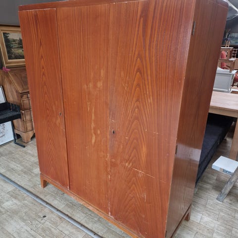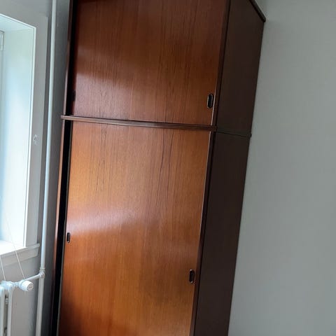 Teaktræs klædeskab, hvidmalet. Solidt. Meget rummeligt. Nemt at flytte da det kan skilles ad. Kommer fra ikke-ryger-hjem.