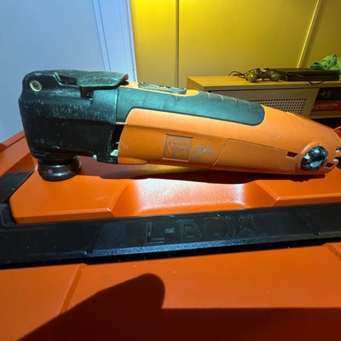 Fein Multimaster multiværktøj med ledning i orange og sort. Værktøjet er et oscillerende multiværktøj, der kan anvendes til forskellige opgaver afhængigt af monteret tilbehør, f.eks. skæring, slibning og skrabning. Enheden har tænd/sluk-knap på toppen og tilsluttes via almindelig netstik. Der medfølger fastmonteret klinge som vist på billederne.