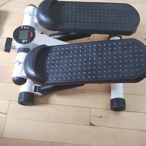 Stepmaskine med træningscomputer. Kompakt stepmaskine til indendørs træning med håndtag og læn foran for støtte under træningen. Udstyret med elektronisk display, der kan vise tid, antal step og estimeret kalorieforbrug. Egnet til hjemmetræning af ben og balder samt let konditionstræning.