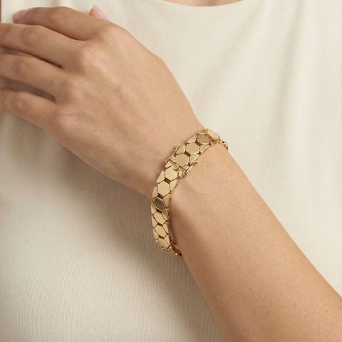 Guld Armbånd i 14 karatEstimeret nypris: 45000,00 kr\nModel: Bicelle\nVægt: 23.43 gram\nLængde: 18 cm\nBredde: 10.45 mm\nStand: Som ses på billeder, god stand med almindelige brugsspor og slidtageHos anotherslegacy.dk får du:\n✓ Gratis fragt på alle produkter\n✓ Pakken sendes inden for 1-2 dage\n✓ Din pakke er forsikret under transport\n✓ 14 dages guld bytte- og returretHos anotherslegacy har vi høje standarder, til de produkter vi sælger:\n• Alle produkter er blevet ultralydsrenset\n• Alle produkter er gennemgået for fejl og mangler\n• Alle produkter har fået en lødighedstest i røntgen maskine. Vi sælger IKKE forgyldte genstande\nBook en fremvisning i dag.Butik:\nH. C. Andersens Blvd. 38 st. tv., 1553 København V\nMandag-Fredag 09:00-17:00\nGG180962
