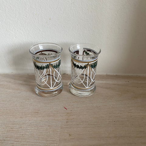 Holmegaard juledramglas med julemotiv. Sættet består af to glas i klart glas med trykte julemotiver i farver.