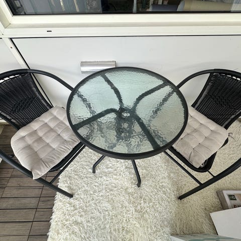 2 Rundt cafébord med glasplade og metalstel. Bordet har rund glasbordplade og ben i metal med fire fødder. Egnet til brug på terrasse, altan eller i haven som lille spise- eller caféplads. 4 café stole, og en hyndeboks