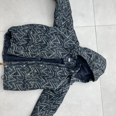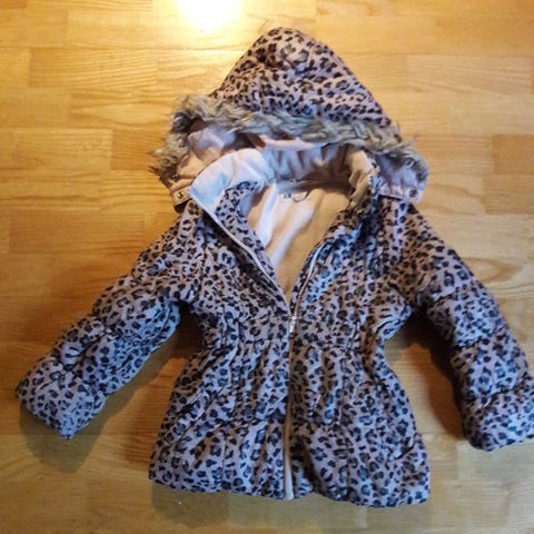 Flot leopardmønstret vinterjakke med aftagelig hætte. Stroppen i nakken er knækket.
