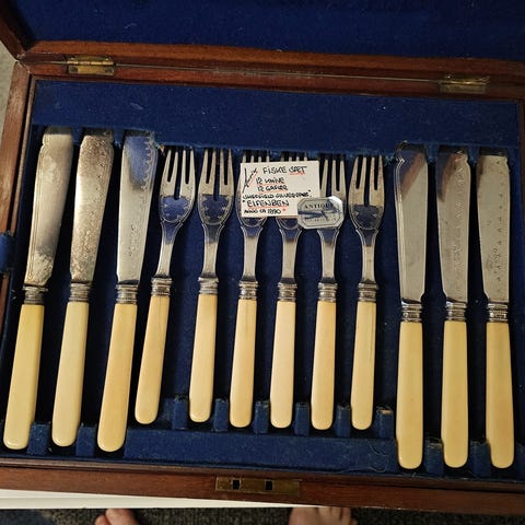 Fiskebestik 12 gafler + 12 knive i en trææske. Der er tale om Sheffield plet sølv muligvis fra omkring 1900.