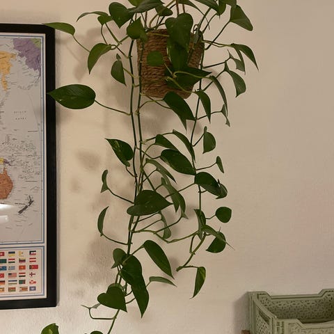 Guldranke stueplante med grønne, brogede blade. Planten er vist i en glasbeholder med vand og rødder, hvilket gør den egnet til dyrkning i vand eller omplantning i jord efter behov. Velegnet som indendørs klatre- eller hængeplante og kan placeres i stue, kontor eller andre opholdsrum med indirekte lys.