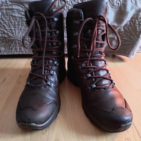 Haix Goretex militær støvler i str. 42. Støvlerne er brune med snørelukning og kraftig mønstret ydersål. Overdelen er i et robust materiale med forstærket tå- og hælområde. Indvendig polstret skaft for øget komfort. Velegnet som kraftige hverdags- eller fritidsstøvler.