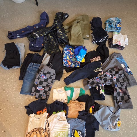 Tøjpakke a str 116 - Ny pris samlet langt over 3000 kr.: 1 fleece trøje pomp delux, 1 sæt regntøj wheat, 1 sæt termotøj wheat, 1 vest h&m, 4 par shorts, 1 par badeshorts og 1 uv trøje, 4 sweatshirts, 10 par bokseshorts, 4 undertrøjer, 2 sæt natsæt med tshirt og shorts, 11 t-shirts, 8 par lange bukser. Fra hjem uden røg og dyr. Vasket uden parfume. Brugt men fejler absolut intet.