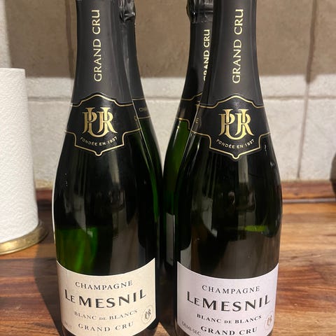 Le Mesnil Grand Cru champagne. Mousserende vin på flaske med klassisk champagneprop og sort folie. Etiketten angiver Grand Cru fra Le Mesnil. Velegnet som drikkevin til fx festlige lejligheder eller som ledsager til mad, alt efter årgang og dosage angivet på den enkelte flaske.