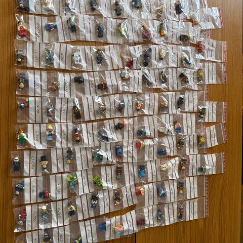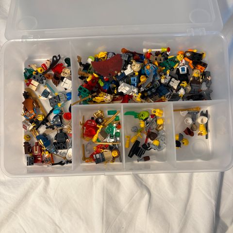 Lego blandede minifigurer og tilbehør. Samlingen omfatter forskellige figurer fra flere Lego-serier, herunder blandt andet superhelte, fantasifigurer, dyr og diverse tematiserede figurer. Der ses også løse dele som hjelme, hoveder, hår, våben og andet udstyr. Velegnet som supplement til eksisterende Lego-samlinger, til leg eller som reservedele til at fuldende andre sæt. Antallet af figurer og dele fremgår af billederne.