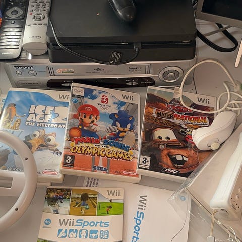 Sættet omfatter to Nintendo Wii konsoller i hvid farve med strømforsyning og tilslutningskabler. Der medfølger flere Wii Remote-controllere samt Nunchuk-tilbehør. På billederne ses også spil som blandt andet Super Mario Galaxy 2, Wii Sports (uden cover) og yderligere titler på disk i originale æsker. Spillene er testet.