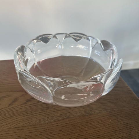 Holmegaard glasskål i klart glas. Skålen har et rillet, bladlignende mønster og bølget kant hele vejen rundt. Velegnet som serveringsskål til fx salat, frugt eller snacks samt som dekorationsskål i køkken eller stue.
