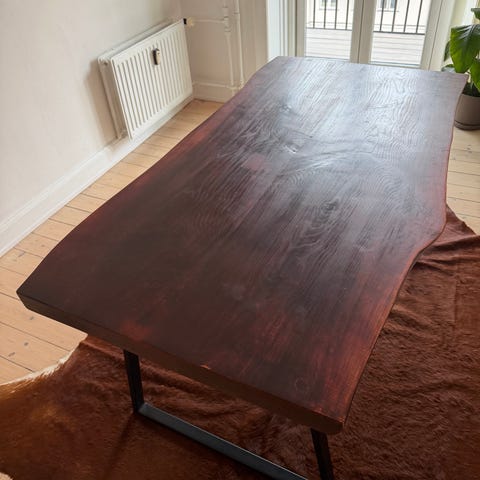 Bordplade i massiv fyrretræ,mørkbejdset og lakeret med skibslak.