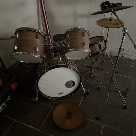Komplet, solidt trommesæt. Solidt pga de mange bespændinger. Der er 12 og 13" sidetams, 14" lilletromme, 16" gulvtam, 14" Stagg hihat og et 16" Meinl vellydende crash bækken på trods af beskæring. Stikker medfølger.