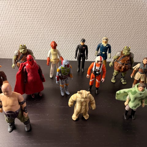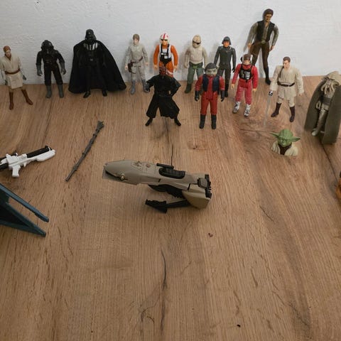 Star Wars actionfigurer samling. Blandede figurer fra Star Wars-universet samt tilhørende våben og køretøjer. Forskellige størrelser og farver figurer mm. Egnet til leg eller som supplement til en eksisterende Star Wars-samling.