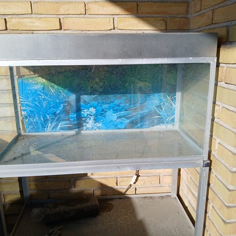 Akvastabil akvarie 80liters. Akvariet står på et bord med metalben og sort træplade, som kan undværes. Akvariet er af ældre dato, men har været i brug uden problemer og har holdt fint tæt. Der medfølger lampe, dekorationer, planter og en masse væsker og mad. Noget nok for gammelt, så det skal nok sorteres. Akvariet mål er bredde 70 cm højde 35cm . Bordet med olde er 55 cm højt. Sælges samlet