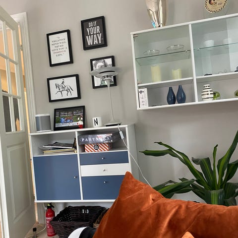 Tingene, der står på reolen, samt kunst og finurligheder på væggen medfølger ikke