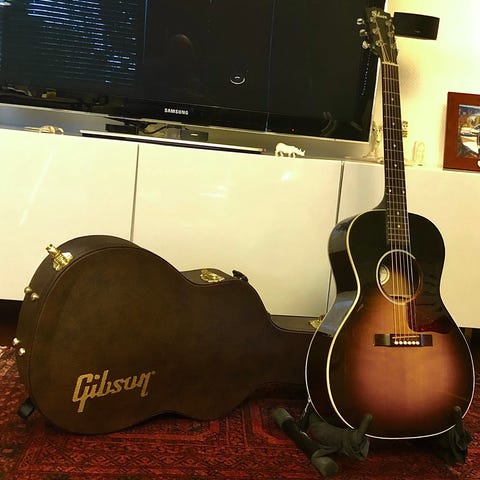 Gibson akustisk guitar i dreadnought‑form med sunburst‑finish. Nypris 30000kr. Kroppen har stor resonanskasse med bindings langs kanterne og dekorativt slagplade. Halsen har gribebræt med indlagte positionmarkeringer og standard stemmeskruer på hovedet. Velegnet til både akkordspil og fingerspil i akustiske sammenhænge.