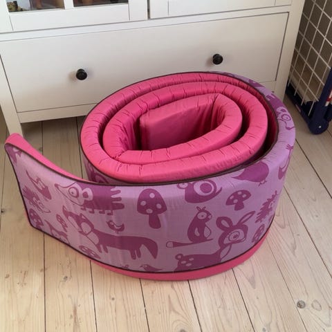 Sebra børneseng rutsjebane i træ med hvide sider. Rutsjebanen kan monteres på en børneseng, så barnet kan glide ned fra sengen. Den har en glat rutscheflade i lyst træ og afrundede kanter. På bagsiden ses greb i forskellige farver, som kan bruges til at flytte og håndtere rutsjebanen. Velegnet til indendørs brug på børneværelset som ekstra legefunktion til sengen.