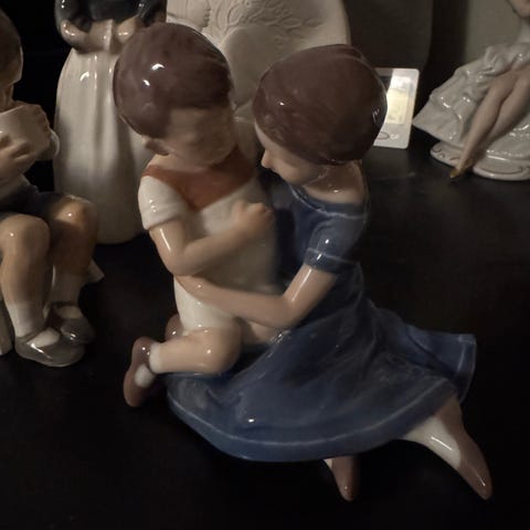 Bing & Grøndahl porcelænsfigur model 1567 forestillende to børn, der sidder sammen og læser i en bog. Figuren viser et barn i kjole og kyse i blå og hvide nuancer samt et barn i lyst tøj, der holder om hinanden, mens de ser i en åben bog. Glaseret porcelæn med stempel i bunden med B&G Denmark og modelnummer 1567 JE. Velegnet som dekoration i stue, reol eller vitrineskab samt til samlere af Bing & Grøndahl porcelænsfigurer.