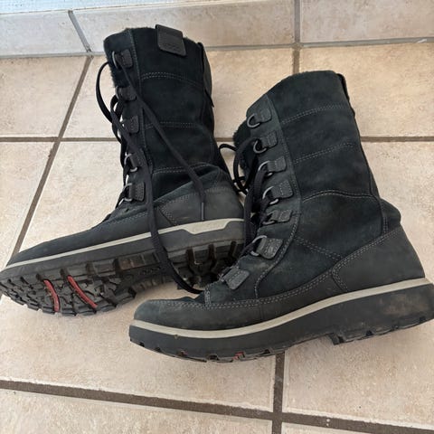 Ecco Hydromax vinterstøvler i str. 37. Støvlerne eri gråt med snørelukning og kraftig gummisål med mønster. De har Hydromax-behandling, som er designet til at gøre læderet mere modstandsdygtigt over for fugt. Indvendigt er der blødt, fleece-lignende for, som dækker hele skaftet for ekstra varme. Velegnet som vinterfodtøj til hverdagsbrug og udendørsaktiviteter i koldt vejr.