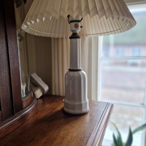 Stor model Heiberg lampe Virker som den skal. lampen har navnet efter wilhelm Marstrands maleri fra 1870 af familien Heiberg,der sidder omkring sådan en lampe Måler højde 36 cm.