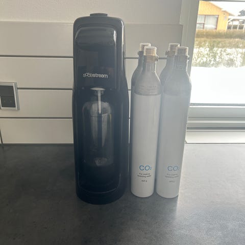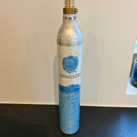 Sodastream kulsyrepatron der er cirka 70/80 % fuld. Har gevind i toppen og skal skrues fast.