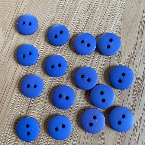 Blå runde knapper i plastik med fire huller. Velegnet til syning og reparation af tøj, tilbehør eller kreative projekter. Knapperne kan bruges på fx jakker, skjorter, strik eller tasker afhængigt af størrelse og behov.