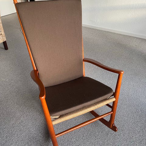 Hans j wegner gyngestol, bøg træ med flet brugt men i god stand. Der er lidt ridser på bagbenet, det kan ses på billederne. Der er lidt pletter på flet men det kan rense det, men pæn stand .