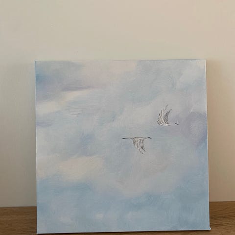 Maleri på lærred med motiv af en stor sommerfugl. Farverne er primært rød, gul, orange og hvide detaljer på en abstrakt baggrund. Billedet er rektangulært og egner sig til ophængning på væg i stue, kontor eller andre opholdsrum som dekorativ vægkunst.