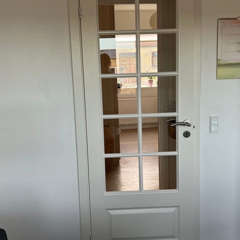 Indvendig dør med glasfelter og sprosser i hvid ramme. Døren har flere rektangulære glasruder, som giver godt lysgennemfald mellem rummene. Leveres med dørgreb og låsekasse monteret. Velegnet som indvendig skille dør i bolig, kontor eller lignende, hvor der ønskes visuel kontakt og lys mellem rum.