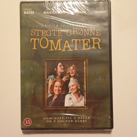 Stegte grønne tomater DVD film. Dansk udgivelse af spillefilmen "Stegte grønne tomater". Forsiden viser hovedrolleindehaverne og angiver aldersgrænsen 15 år. DVD’en er egnet til afspilning i standard DVD-afspillere og kan ses med relevant sprog- og undertekstindstilling afhængigt af udgivelsen.
