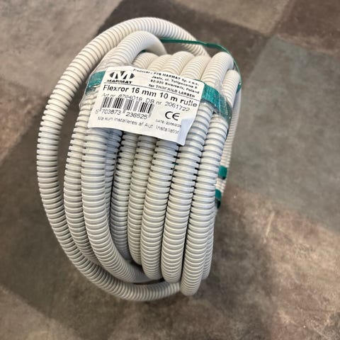 Wavin korrugeret el-rør flexrør med en diameter på 16 mm og en længde på 100 meter i hvid plast. Velegnet til installation af elektriske kabler og ledninger i væg, loft eller gulv, hvor der ønskes fleksibel føring og beskyttelse af kabler. Røret er markeret med relevante godkendelser og kan anvendes i almindelige el-installationer indendørs.